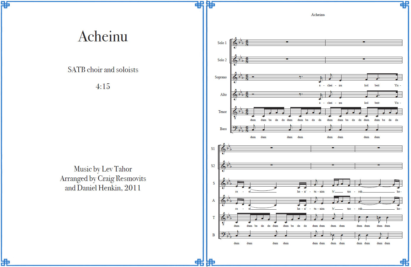 Purchase ArrangementAcheinu SATB choir and soloists Music by Lev Tahor Arranged by Daniel Henkin and Craig Resmovits, 2011 Difficulty level: Intermediate Genre: Religious Language: Hebrew Contains solos: Yes Duration: 4:15 Price: $85 Purchase this arrangement View: Terms and conditions for purchasing and using digital content Preview (click on image to view):