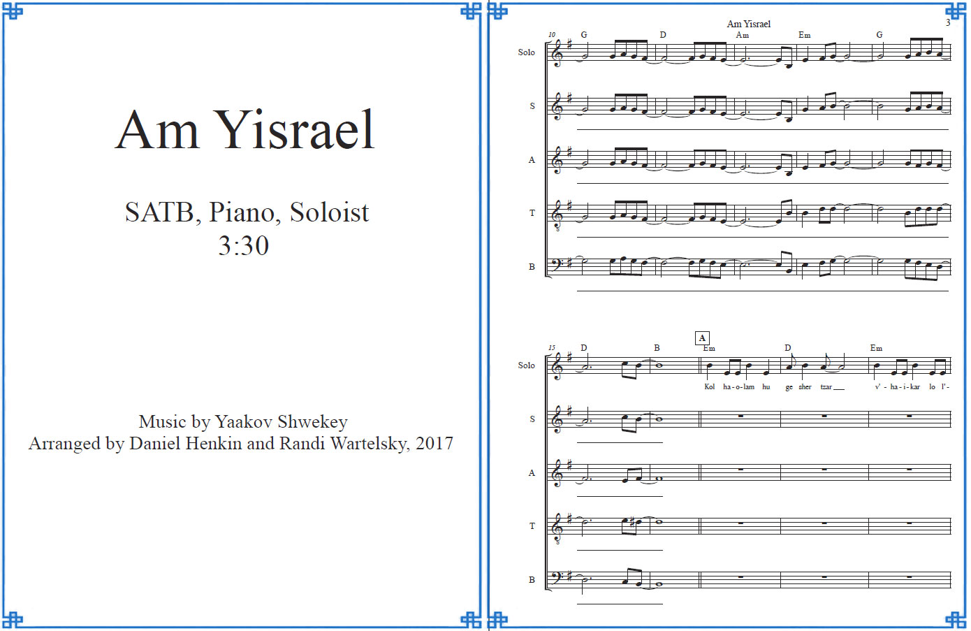 Purchase ArrangementAm Yisrael SATB, Piano, Soloist Music by Yaakov Shwekey Arranged by Daniel Henkin and Randi Wartelsky, 2017 Difficulty level: Intermediate Genre: Israeli Language: Hebrew Contains solos: Yes Duration: 3:30 Price: $85 Purchase this arrangement View: Terms and conditions for purchasing and using digital content [simpay id="422"] Preview (click on image to view):