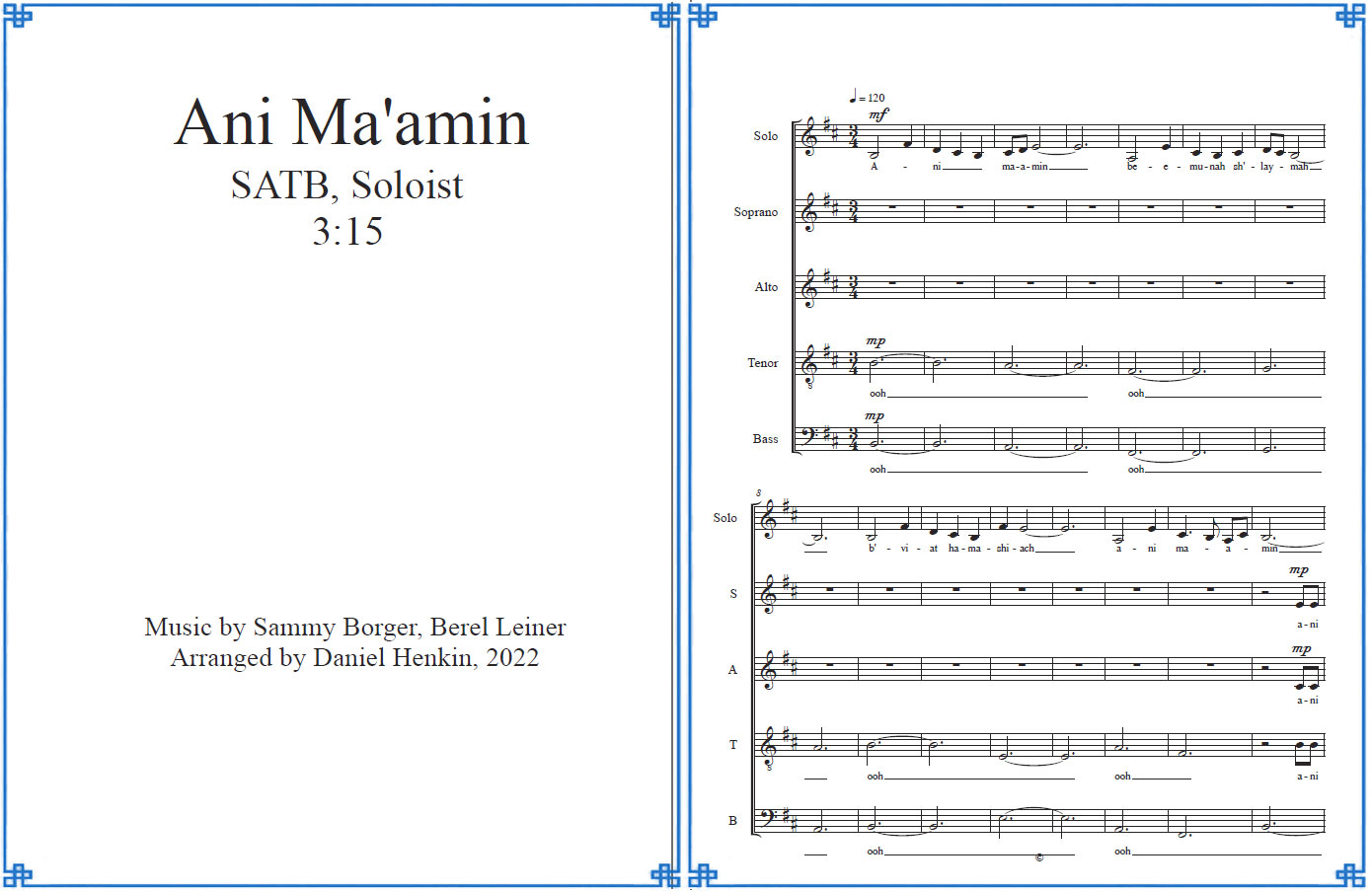 Purchase ArrangementAni Ma'amin (Borger/Leiner) SATB, Soloist Music by Sammy Borger, Berel Leiner Arranged by Daniel Henkin, 2022 Difficulty level: Intermediate Genre: Religious Language: Hebrew Contains solos: Yes Duration: 3:15 Price: $85 Purchase this arrangement Ani Ma'amin (Borger/Leiner) – sample audio filehttps://danielhenkin.com/wp-content/uploads/2025/09/Ani-Maamin-Borger_Leiner-audio-.mp3View: Terms and conditions for purchasing and using digital content Preview (click on image to view):