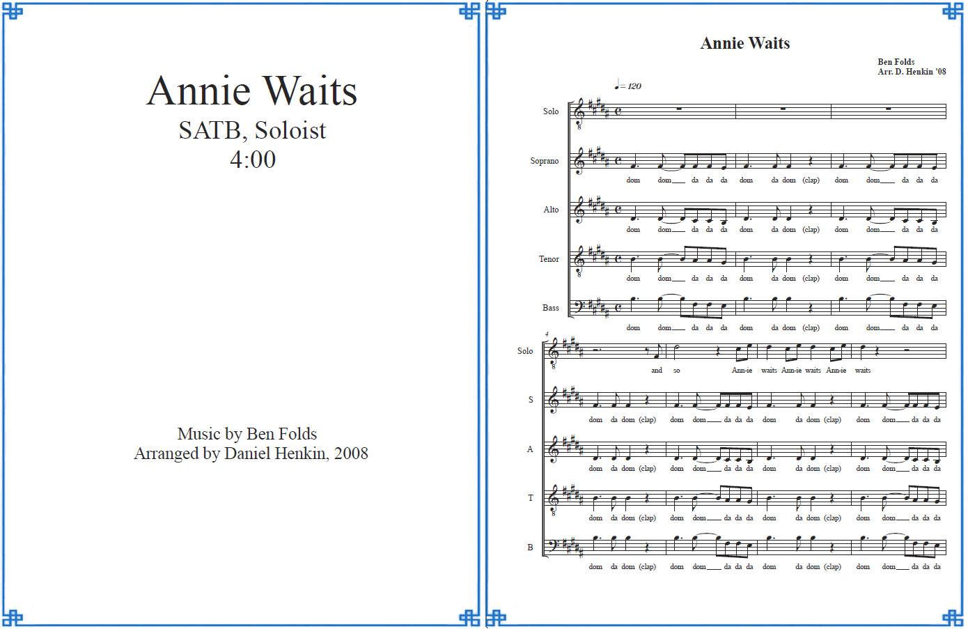 Purchase ArrangementAnnie Waits SATB, Soloist Music by Ben Folds Arranged by Daniel Henkin, 2008 Difficulty level: Intermediate Genre: Secular Language: English Contains solos: Yes Duration: 4:00 Price: $85 Purchase this arrangement Annie Waits – sample audio file https://danielhenkin.com/wp-content/uploads/2025/09/Annie-Waits-Audio.mp3View: Terms and conditions for purchasing and using digital content Preview (click on image to view):