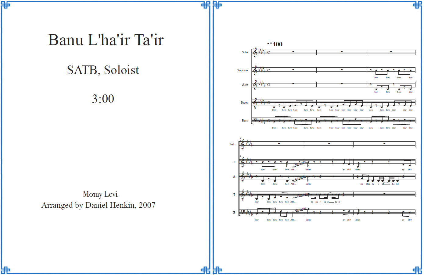 Purchase ArrangementBanu L'ha'ir Ta'ir SATB, Soloist, Band Momy Levi Arranged by Daniel Henkin, 2007 Difficulty level: Intermediate Genre: Israeli Language: Hebrew Contains solos: Yes Duration: 3:00 Price: $85 Purchase this arrangement View: Terms and conditions for purchasing and using digital content Preview (click on image to view):