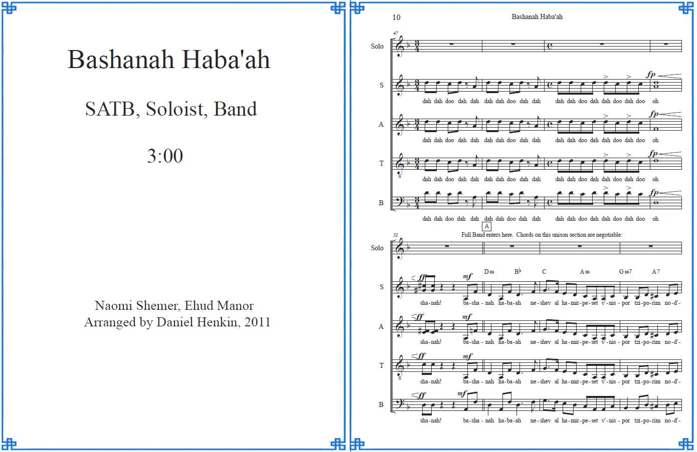 Purchase ArrangementBashanah Haba'ah SATB, Soloist, Band Naomi Shemer, Ehud Manor Arranged by Daniel Henkin, 2011 Difficulty level: Advanced Genre: Israeli Language: Hebrew Contains solos: Yes Duration: 3:00 Price: $85 Purchase this arrangement View: Terms and conditions for purchasing and using digital content Preview (click on image to view):