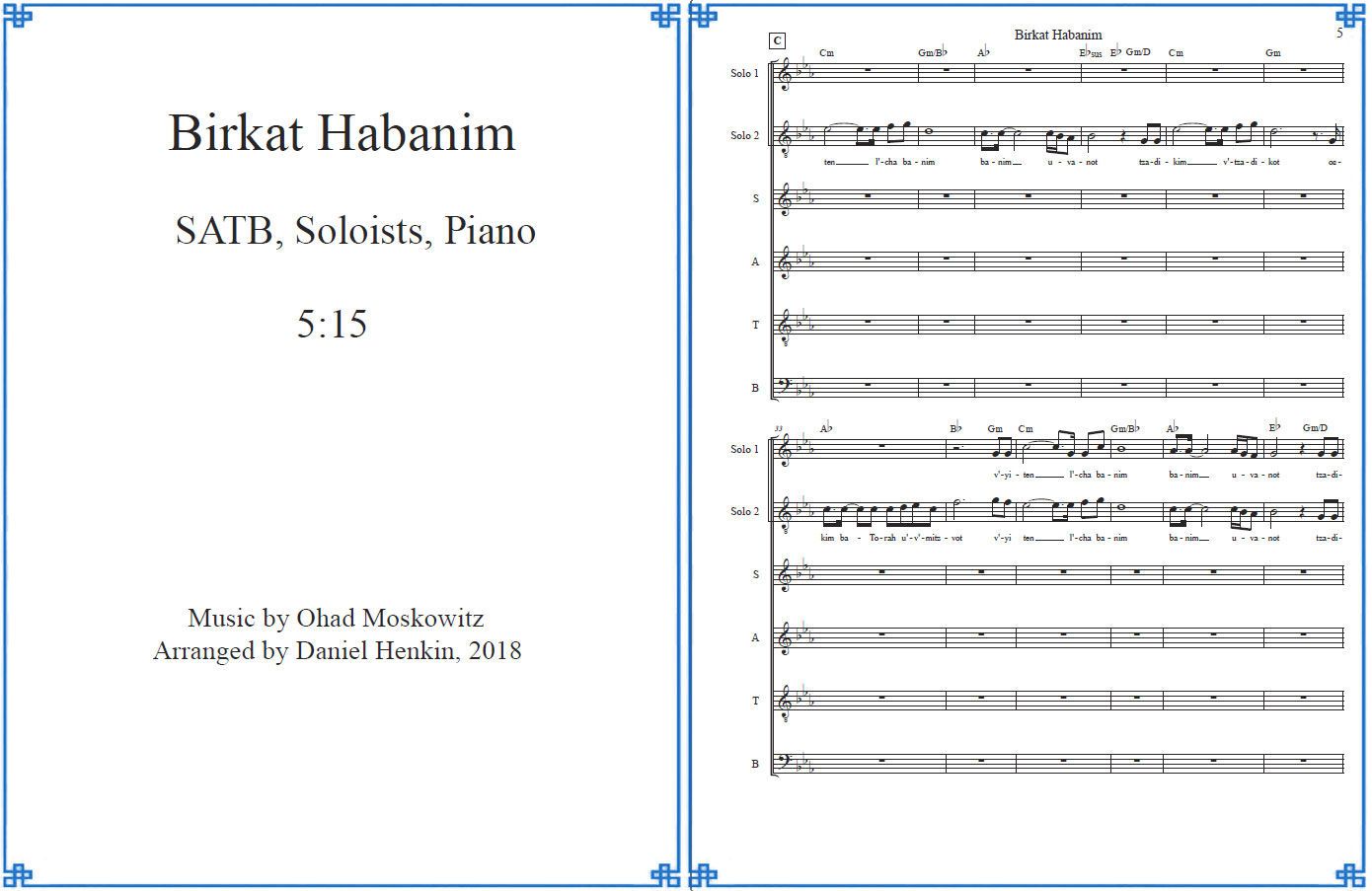 Purchase ArrangementBirkat Habanim SATB, Soloists, Piano Music by Ohad Moskowitz Arranged by Daniel Henkin, 2018 Difficulty level: Intermediate Genre: Religious Language: Hebrew Contains solos: Yes Duration: 5:15 Price: $85 Purchase this arrangement View: Terms and conditions for purchasing and using digital content Preview (click on image to view):
