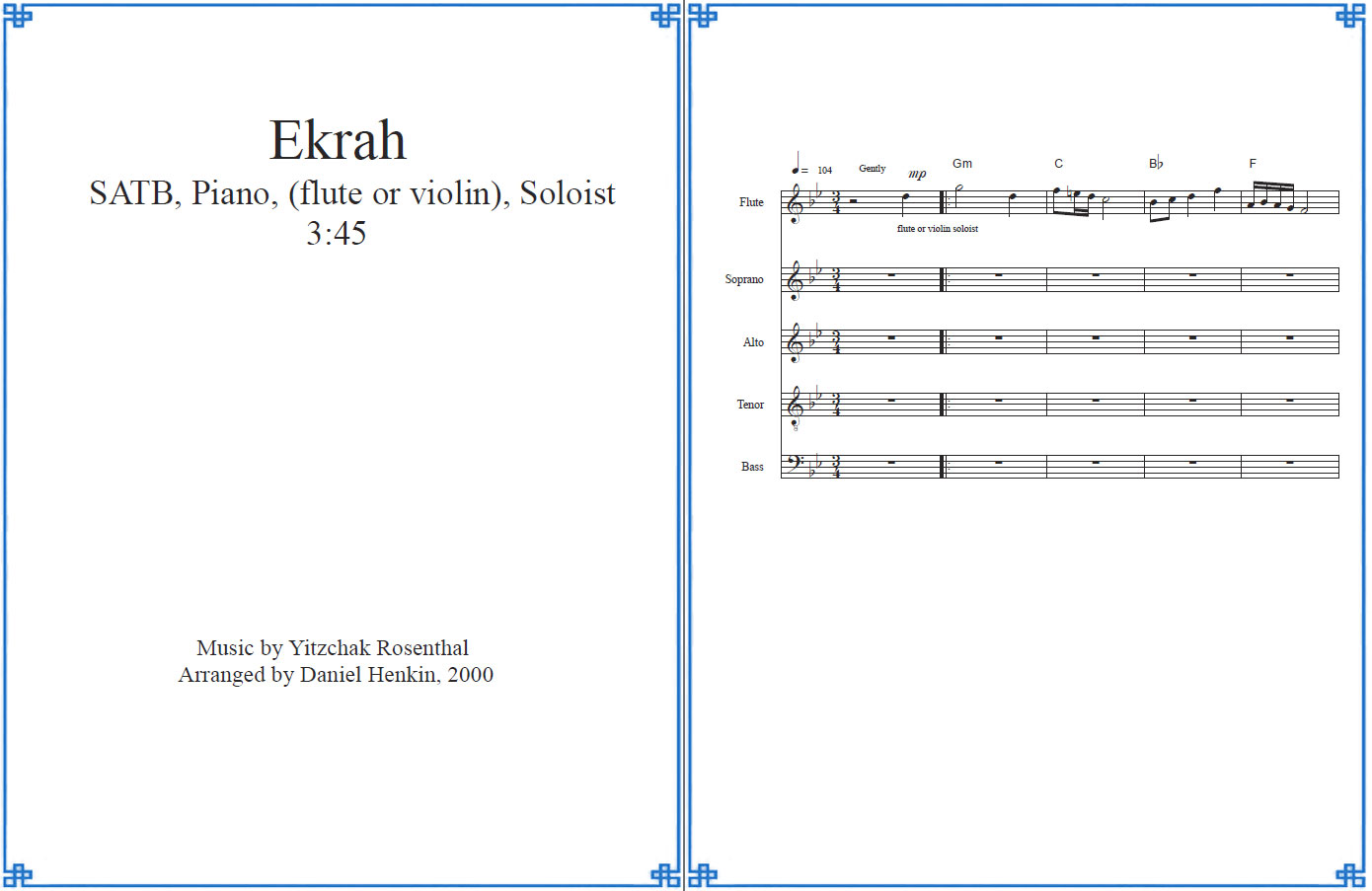 Purchase ArrangementEkrah SATB, Piano, (flute or violin), Soloist Music by Yitzchak Rosenthal Arranged by Daniel Henkin, 2000 Difficulty level: Intermediate Genre: Religious Language: Hebrew Contains solos: Yes Duration: 3:45 Price: $85 Purchase this arrangement Ekrah – sample audio file https://danielhenkin.com/wp-content/uploads/2025/09/Ekrah-audio.mp3View: Terms and conditions for purchasing and using digital content Preview (click on image to view):