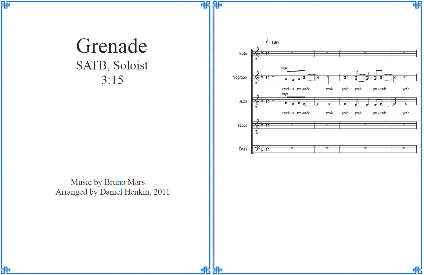 Purchase ArrangementGrenade SATB, Soloist Music by Bruno Mars Arranged by Daniel Henkin, 2011 Difficulty level: Intermediate Genre: Secular Language: English Contains solos: Yes Duration: 3:15 Price: $85 Purchase this arrangement Grenade – sample audio file https://danielhenkin.com/wp-content/uploads/2025/09/Grenade-audio-sample.mp3View: Terms and conditions for purchasing and using digital content Preview (click on image to view):