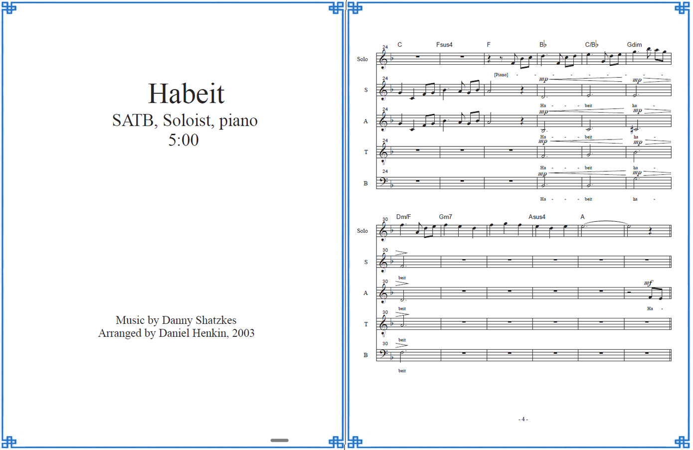 Purchase ArrangementHabeit (Shatzkes) SATB, Soloist, piano Music by Danny Shatzkes Arranged by Daniel Henkin, 2003 Difficulty level: Intermediate Genre: Religious Language: Hebrew Contains solos: Yes Duration: 5:00 Price: $85 Purchase this arrangement View: Terms and conditions for purchasing and using digital content Preview (click on image to view):